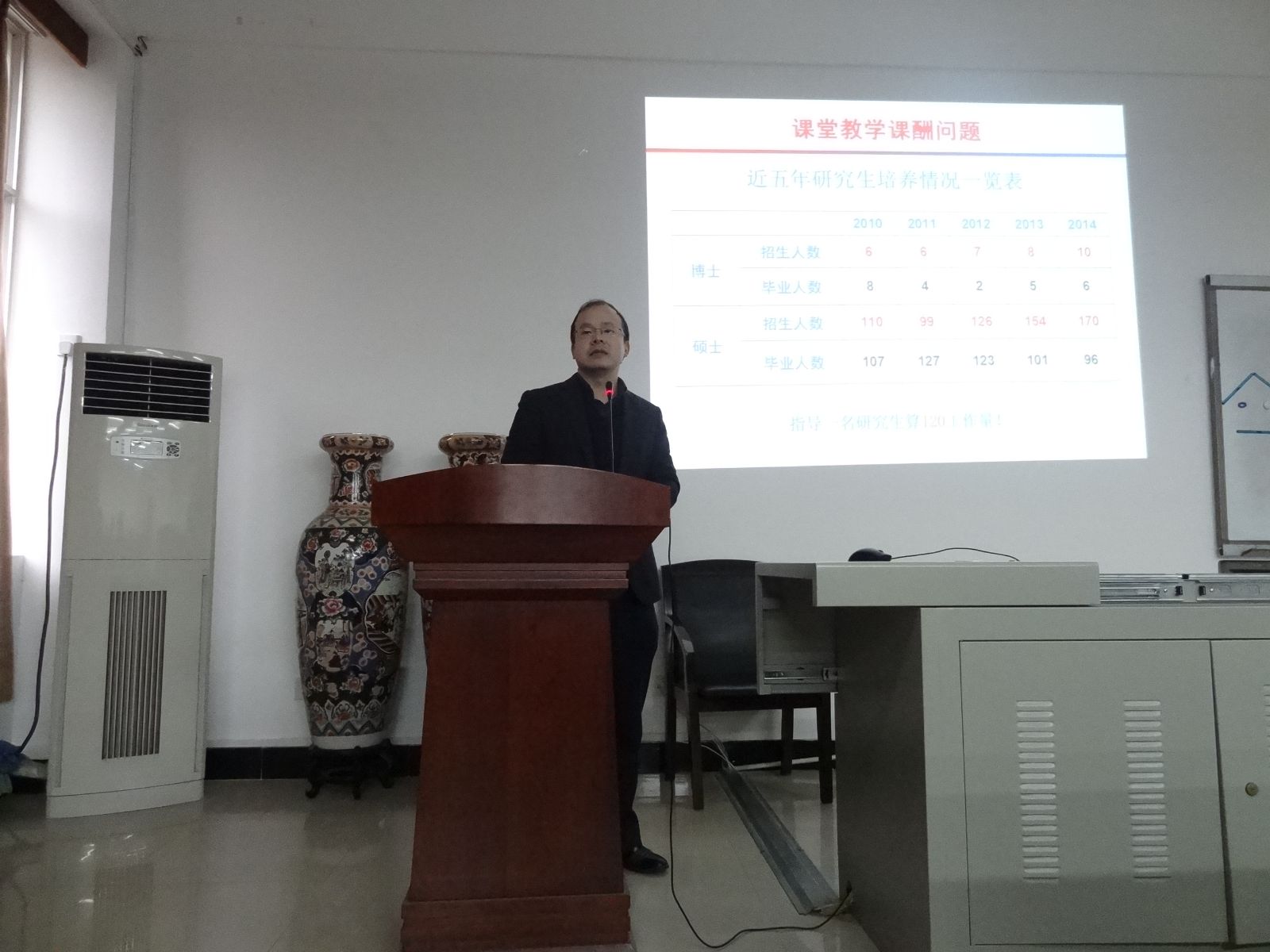 院长邓国军就课堂教学课酬问题作说明。邓国军指出,我院一直是指导一名研究生按120学时计算,研究生招生数量近几年呈递增趋势,2014年达到180人(含博士生),随之指导研究生的学时也不断增加,如何让课堂教学保持在一个比较合理的区间?邓院长提出两种方案,提交大会讨论决定。