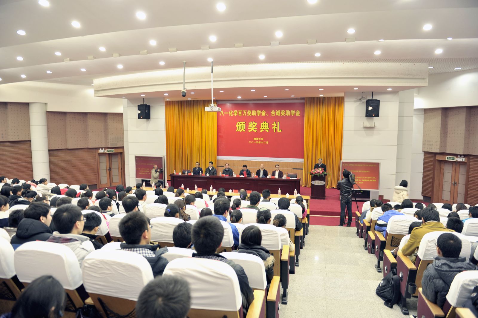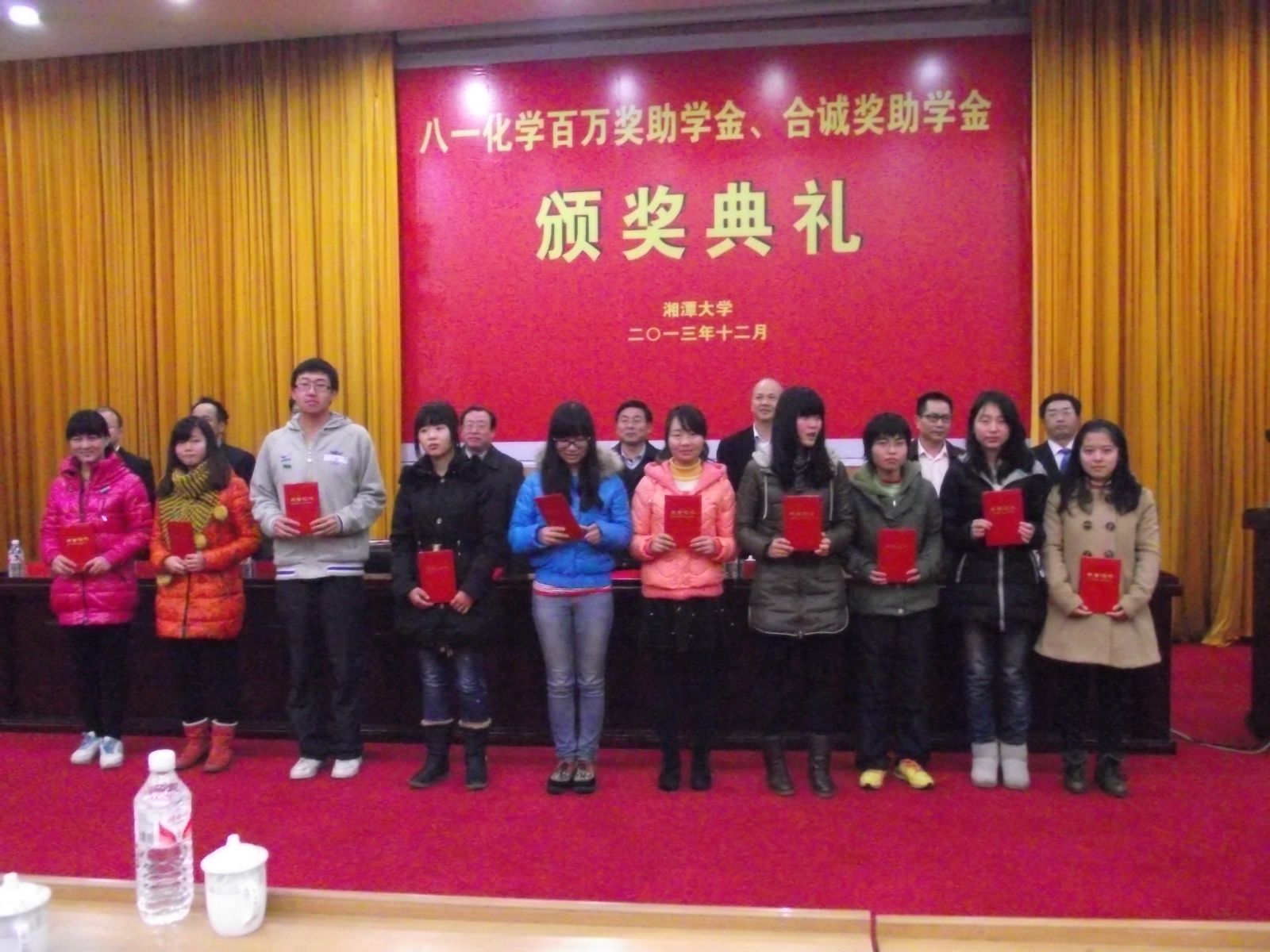 2008年,八一级化学专业的校友共同捐资设立了八一化学百万奖助学金、八一化学专业的蒋文真先生捐资设立了合诚奖助学金,已有393名品学兼优的学生受到奖励和资助,本次是第五次颁奖,又有105位同学受到奖励和资助。颁奖典礼让同学们切身感受到了校友对优秀学子的亲切关怀和殷切期望。同学们表示衷心感谢校友们,并立志以此为契机,以校友为榜样,奋发图强,不负众望,报效祖国,为母校续写新的辉煌。
