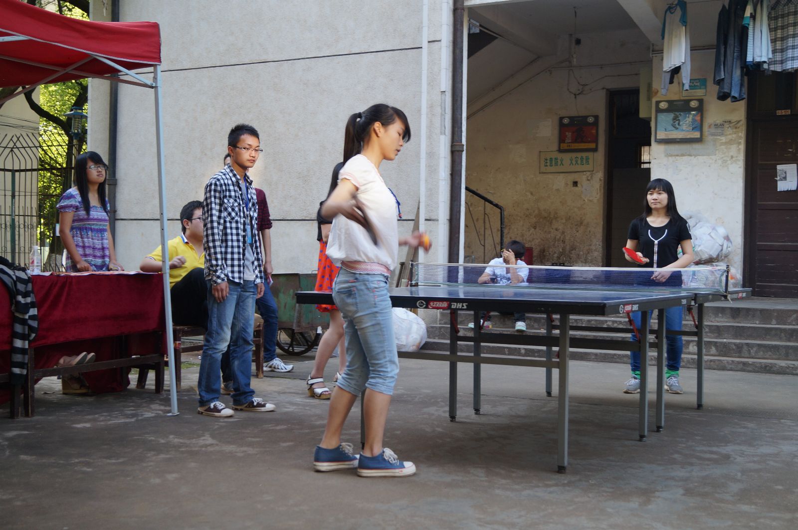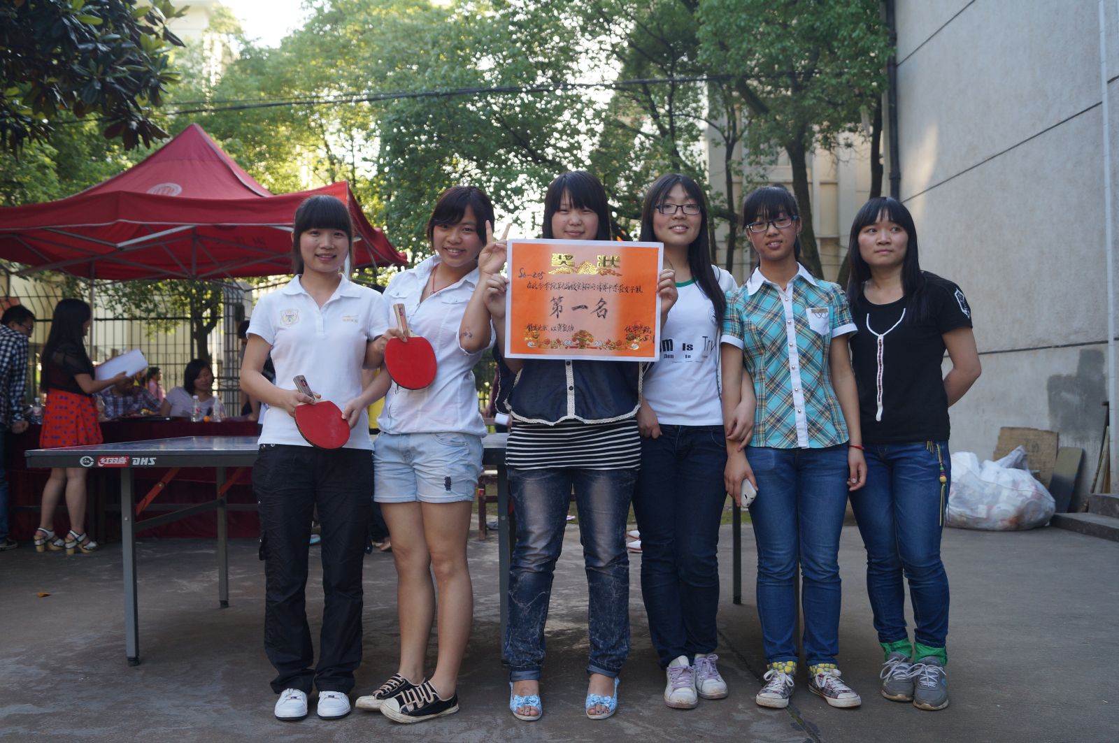 火辣的太阳不能阻挡同学们的激情。首先进行的是男子组季军争夺,比赛双方为甲队S7-202和乙队S7-404。运动员们全力以赴,尽管有一些队员表现紧张的情绪。比赛开始虽然打出了2:0的小高潮,但乙队的后三位选手打出了实力,以3:2的比分扭转局势,赢得季军。接下来,进行的比赛分别是男子组冠、亚军争夺,女子组冠、亚、季军争夺。争夺异常激烈,我们在现场看到,运动员动作敏捷,可想而知平时训练有素,基本功扎实。严密的防守,凌厉的攻势,不时引来阵阵掌声和欢呼声。在“友谊第一、比赛第二”的体育精神感召下,运动员们打着快乐的球、打着友谊的球、打着和谐的球。场上运动员的精彩表演以及场下亲友团的助威,吸引了许多行人的眼球,赛场气氛持续高涨。