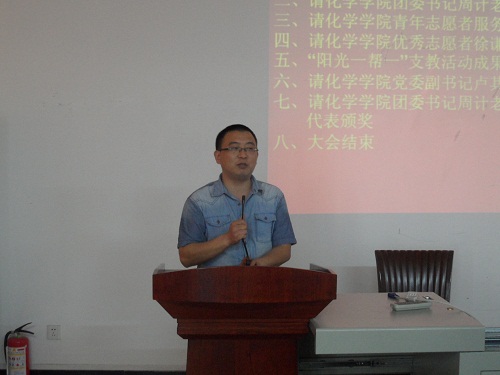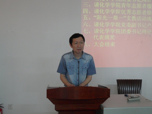 会议首先由主持人介绍了该活动的相关情况,接下来便由卢其斌和周计老师分别发表讲话,在他们的讲话中均表示了对志愿者老师的感谢以及对此活动最真诚的肯定和支持。然后,青年志愿者服务队干事刘献之在其发言中阐述了其在组织此次支教活动中的深刻感受和诸多对如何办好该活动的建议,而优秀志愿者徐谦也向我们分享了在支教过程中的意外收获。最后,由党委副书记其斌老师为优秀志愿者代表颁奖以及团委书记周计老师为优秀组织者颁奖。