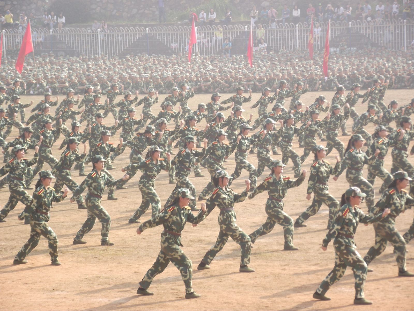 8:30,阅兵式在一片庄严肃穆的国歌声中拉开序幕。校长罗和安依次检阅了各了个方阵部队。“同志们好”,“首长好”,“同志们辛苦了”,“为人民服务”这一声声高昂的呼声响彻整个校园。接着,精彩的教官方阵、男生刺杀方阵、女生军体拳方阵、三道拱门团体操表演赢得了全体在场人员的阵阵掌声。随后,精彩而盛大的分列式正式开始,在浑厚雄壮的进行曲中,一个接一个的参训方阵踢着正步整齐有序地走过主席台,接受领导、教官、老师的检阅。大会还对在军训中的先进集体和优秀个进行了表彰。最后,罗和安校长对此次军训作了总结报告,并高度评价了本次军训所取得的丰硕成果,同时也表达了对教官、随训老师以及全体军训人员的感谢。